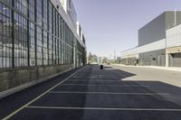 A modern architecture warehouse in a suburban neighborhood of Toronto, Canada. The clear sky casts hard shadows on the open space, highlighting the urban design and infrastructure. A picturesque day in the city.