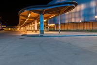 the empty sidewalk at a bus station in the city at night time with light on