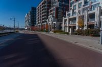 empty city street with two tall apartment buildings in the background on an autumn day's day