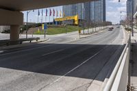 Empty highway in Toronto, Canada with flags lining one side of the road. Urban infrastructure and tall buildings create a cityscape backdrop. Clear day with clouds and a hard shadow. A snapshot of urban life in Ontario.