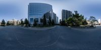 a street that has several buildings in it as seen in a fish eye lens from a fisheye lens