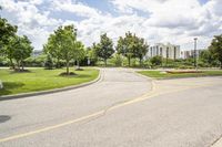A modern residential area in Toronto, Ontario. The neighborhood is surrounded by nature, with trees and grass providing a refreshing escape from the city. The architecture blends seamlessly with the urban design, creating a perfect balance between city life and recreation.