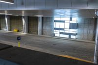 the empty parking garage has some concrete walls and signs on the wall, and a yellow garbage can in front of it