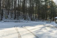 A picturesque parking lot in Toronto surrounded by a winter landscape. The clear sky and sunlight highlight the beauty of the forest and trees covered in snow. A perfect destination for outdoor recreation.