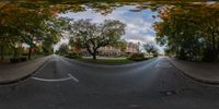 a fish eye view of a street through a fisheye lens with some leaves on the ground