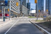 A view down a modern architecture-lined street in Toronto, Ontario. The straight road stretches towards the cityscape of skyscrapers. Clear sky contrasts with the winter landscape. Urban design and city life intertwine on this vibrant street.