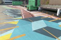 This stock photo captures the vibrant city of Toronto with its modern architecture and urban design. The image showcases a concrete street with a high, composite material road surface. The open space is decorated with colorful graffiti art on the walls, adding an artistic touch to the cityscape. A yellow bench provides a place for city dwellers to relax and enjoy the clear sky. Toronto's art district is known for its elevated painting and graffiti walls, creating a unique and vibrant atmosphere. This image perfectly represents the bustling city life and contemporary urban design of Toronto, Canada.