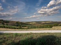 A scenic country road in Tuscany, Italy, winding through a landscape of rolling hills and lush greenery. The clear sky with fluffy clouds adds to the idyllic rural setting.