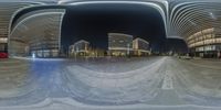 A futuristic cityscape at night, with an unusual modern building as the centerpiece. The lights of surrounding buildings illuminate the open space, creating a vibrant urban atmosphere. People walk along the straight road, adding to the lively city life.