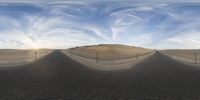 An unusual scene in the desert area of the USA. A straight road with asphalt surface stretches through the sandy landscape. The dawn sunlight casts a golden glow on the coastal horizon, while contrails streak across the sky. A unique Aeolian landform in this 3D rendering.