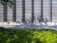 A modern architecture marvel in Berlin, Germany. The concrete wall with horizontal windows stands tall against a neatly arranged green field. The cityscape showcases a perfect blend of urban and natural elements.