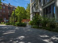 Urban architecture in Berlin, Germany. Modern residential area with hard shadows casting over paver road and open spaces. European city life captured in the design of courtyards and roads.