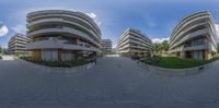 A modern apartment complex in Germany, captured from a unique perspective. The spherical fish-eye photograph showcases the urban design and architecture. Clear sky casts hard shadows on the cobblestone road and asphalt surface.