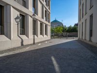 Urban Berlin cityscape under a clear European sky. Modern architecture casts hard shadows on residential areas. Explore the city through straight alleyways and urban design. A snapshot of city life in Europe.
