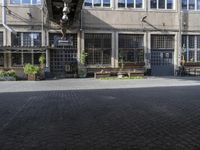 an empty parking lot in an urban area with windows and benches to sit and relax on