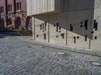 cobblestone driveway surrounded by modern buildings on sunny day with sun reflecting onto the windows