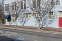 A modern urban setting with a building featuring a red door and several bare trees lined along the side. Sunny day illuminates the architecture, creating a vibrant city scene.