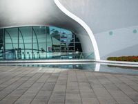 This image captures the modern architecture and urban design of Taipei, Taiwan. The city's vibrant atmosphere is reflected in the bustling streets and lively city life. The photo showcases a building with a pool and walkway, surrounded by the dynamic cityscape. A person stands on either side, adding a human element to the scene. This snapshot captures a typical day in Taipei, where the city's surface reflects the energy and creativity that define the urban landscape of Taiwan.