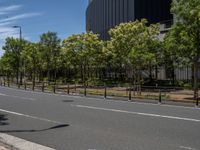 A modern urban road surrounded by city skyscrapers. The asphalt road reflects the clear day sky. The urban design and modern architecture contribute to the vibrant city life.