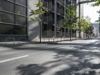 This image captures the modern architecture of Berlin, Germany. The cityscape showcases a mix of office buildings and residential neighborhoods. The roads are lined with trees, and the asphalt road surface casts hard shadows on the buildings and public spaces. This urban design reflects the dynamic city life of Berlin, a bustling business district in Europe. The sharp lines and facades of the buildings create a visually appealing architectural composition. This photo represents a typical day in Berlin, with its blend of modern architecture, urban design, and business activity.