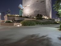 A night view of a modern architecture building in the business district of Dallas. The concrete streets and asphalt roads provide a sleek surface to navigate the urban cityscape. The clear sky contrasts with the artificial lights illuminating the office buildings.
