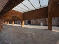 A view of a classic architecture in an art district in Shanghai, China. The beige brick walls and cobblestone road surface create a charming urban design. Hard shadows cast by the arches and fixtures add depth to the composition.