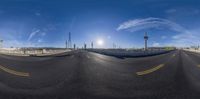 A fisheye lens captures an expansive view of an empty street in Los Angeles. Modern architecture and high-rise buildings dominate the cityscape. Clear skies and sunshine create a vibrant atmosphere in this bustling metropolis.