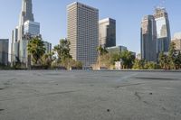 A view of downtown Los Angeles, California, with its iconic skyline of skyscrapers. The urban design incorporates open spaces and parking lots. Rugged graffiti walls add personality to the cityscape.