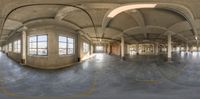 A bird's eye view of a modern concrete office building, with multiple windows and arches. The arched ceiling creates an interesting urban design. The straight road below casts hard shadows on the open space. A sunny day adds warmth to the city landscape.