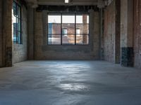 Industrial building with large windows and urban design elements. Dirty concrete floor adds a gritty touch to the urban scene. Straight down the road, a glimpse of city life through a few windows.