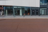This image captures the urban landscape of Toronto, Ontario, Canada. In the foreground, there are chairs outside a business building, facing a street sign seen through the window. The concrete facade of the building and the asphalt road surface add to the modern, urban design of the area. The bustling business district can be seen in the background, with office buildings and city streets. The image depicts a typical day in the busy city of Toronto, with people going about their daily activities. This photo showcases the unique urban atmosphere and architectural profile of Toronto.