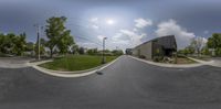 a wide angle view of the street and parking lot with a skateboarder on it