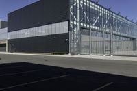 This is an image of a modern office building in Toronto, Canada. The building has a black facade with glass walls and doors, creating a sleek and contemporary look. It is situated in an urban area, surrounded by open spaces and other buildings. The clear sky provides a backdrop, casting hard shadows on the road surface and the surrounding area. This photo captures the essence of urban design and modern architecture in Toronto, showcasing the city's vibrant and dynamic atmosphere.