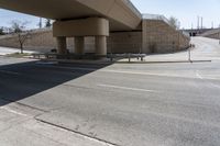 This stock photo showcases the urban infrastructure of Toronto, Ontario, Canada. The photo features a road surface with a distinct shade and curb made of tar and composite material. The architecture of the city can be seen with an asphalt bridge in the background. The image also highlights the vibrant city life and the architectural elements of the tile wall. The photo represents the urban design and structural elements of the residential and suburban areas in Toronto. It captures a daytime scene with hard shadows and an underpass entry to a driveway.