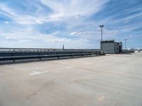 an empty parking lot with metal stairs leading down to a building in the background and bright blue sky