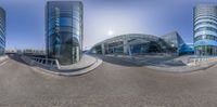 three buildings and their reflection in a large mirror lens lensed photo of a city street