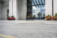 This stock photo features a modern architecture of an office building in the bustling business district of Toronto, Ontario, Canada. The image captures the city life with people walking on the asphalt road and the vibrant urban surroundings. The view showcases the well-maintained road surface lined with trees and foliage, adding a touch of nature to the urban landscape. The public space is designed with attention to detail, including curbs and flowers. The photo represents the urban design and contemporary architecture that Toronto is known for, making it a perfect depiction of the city's culture and success.