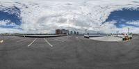 A fisheye lens captures the urban landscape of Toronto. The parking lot, surrounded by concrete and asphalt, stands elevated. Clouds create dramatic shadows on the open space, revealing the city's urban design.