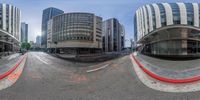 A 360-degree view of the bustling city of Los Angeles, California. Tall buildings and skyscrapers dominate the skyline. The busy city streets are lined with trees and vibrant yellow lines. A true representation of urban life in the USA.