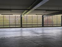 a view from the back of an underground parking garage with concrete floors and striped windows