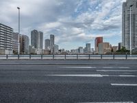 Cityscape of Tokyo, Japan at dawn. Modern architecture and urban skyline featuring an Armco Barrier bridge. Grey sky contrasts with the asphalt road. A profile view of Tokyo's urban landscape.