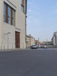 A bustling city street in Berlin, Germany, with modern architecture and a clock tower in the distance. Cars zip by on the asphalt road, while street lights illuminate the urban landscape.