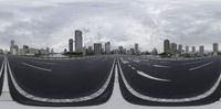 the city skyline is seen through the glass lens of a virtual reality set up in front of a large road