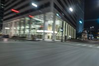 A nighttime view of Chicago, Illinois. The city's modern architecture is illuminated by street lights, creating a dynamic cityscape. Car lights streak across the concrete streets, adding to the motion and energy of the bustling urban environment.