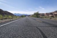 a lone road in the desert with mountains in the distance and trees in the foreground