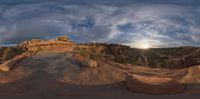 Utah's dawn breaks over a rocky landscape, casting hard shadows as the sun becomes visible. Dark night transitions to sunny open spaces, creating a nature-filled scene under the clear sky.