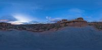 Utah landscape at dawn, with the sun visible in the open space casting hard shadows on the rock surface. Dark night gives way to a sunny break of day, creating stunning contrasts.