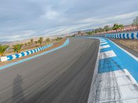A race track in the USA curves through the asphalt. Clear skies provide perfect conditions for a day of racing. Clouds add drama to the high-speed action.