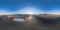 A racing track in the USA at dawn, with the sun visible in the sky. The asphalt road curves through the open space, casting hard shadows. A perfect day for racing.