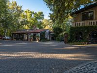 a courtyard has many trees surrounding it and cars parked on the side of it on the side
